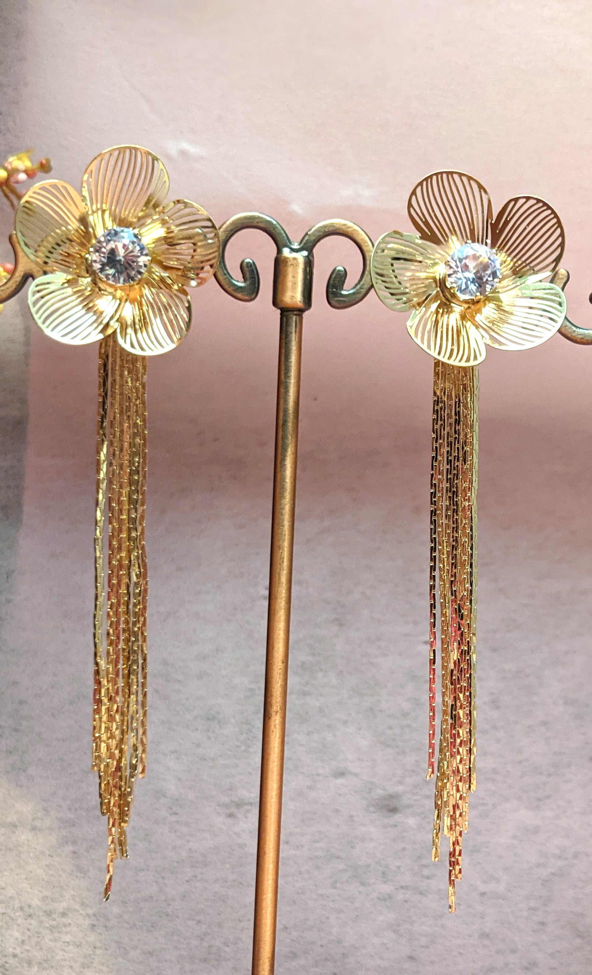 Elegant artificial flower earrings with shimmering petals and cascading gold chains for a dramatic flair.