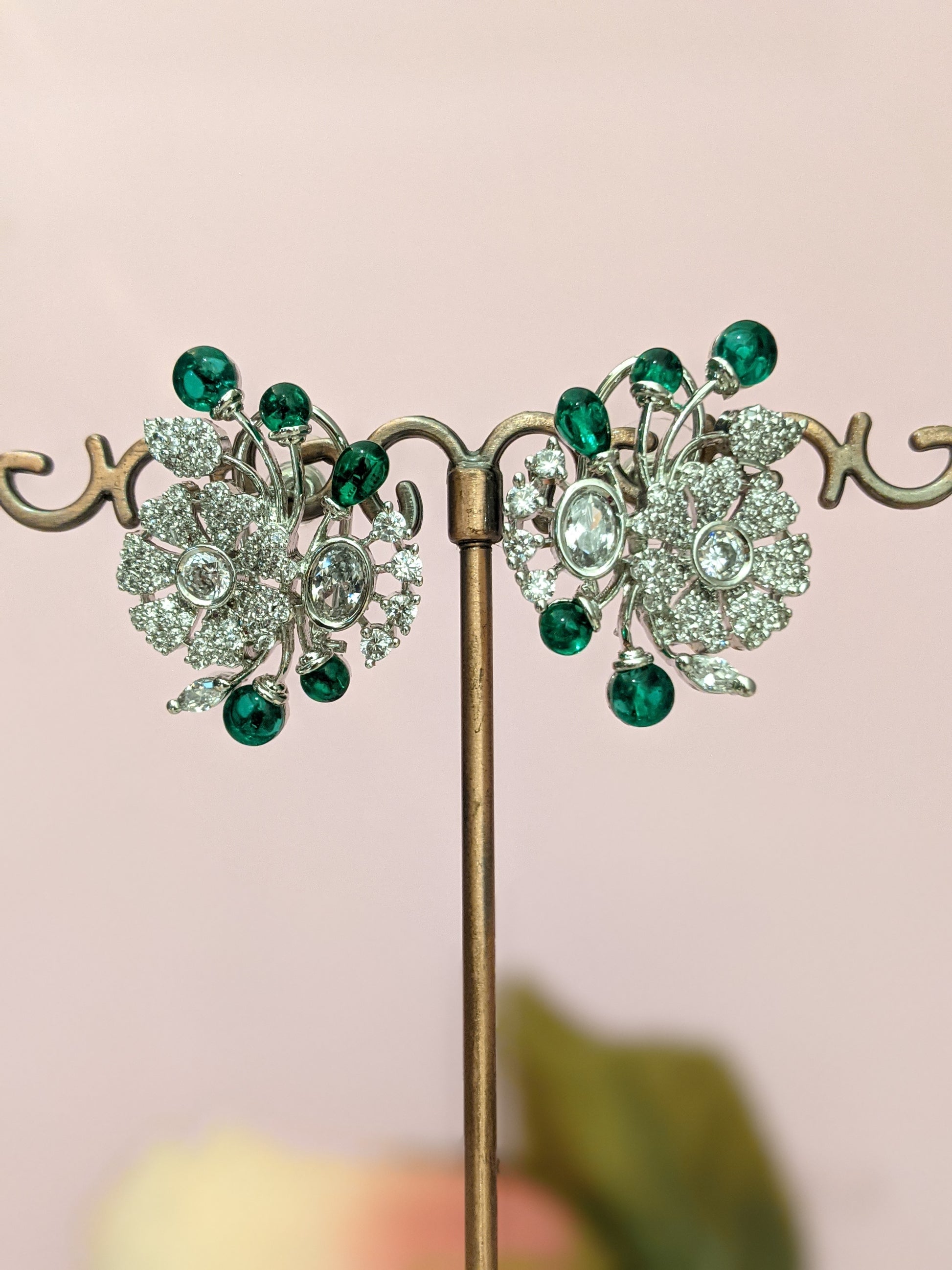 Stunning artificial earrings with a floral crystal design accented by vibrant green stones.